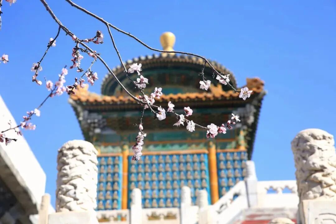 为方便游客拍照打卡,公园推荐两个摄影机位:一是塔台西侧栏杆下;二是在通往白塔的台阶上回望。朱红色的宫墙、金黄色的屋顶脊兽与粉白娇嫩的桃花交相辉映,非常出片。