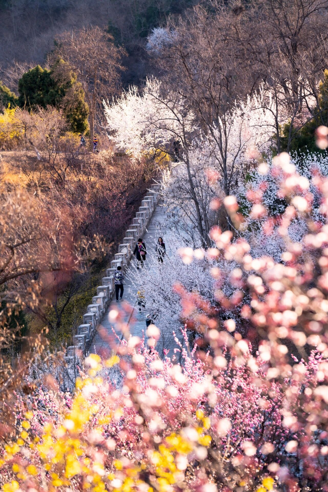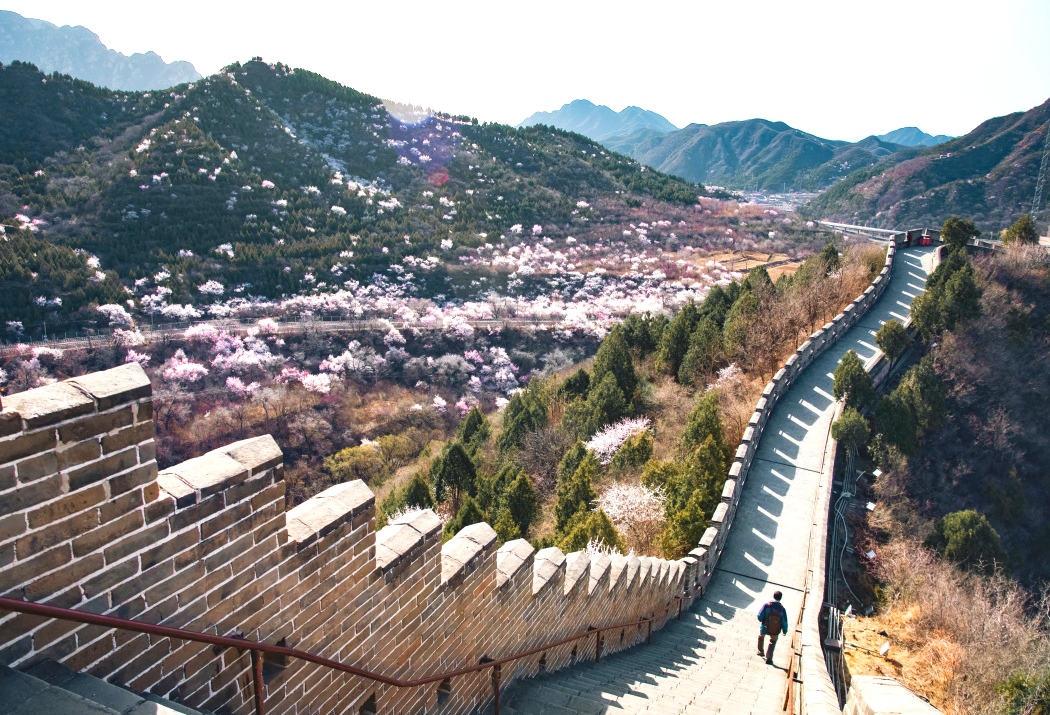 居庸关花海以杏花、山桃花为主,S2线是国内第一列“开往春天的列车”,行走在“百年京张”的铁路上,看长城蜿蜒,春花遍野。在居庸关长城3号-4号烽火台不仅能欣赏到列车驶过花海,还可以观赏到“居庸叠翠”的美景。